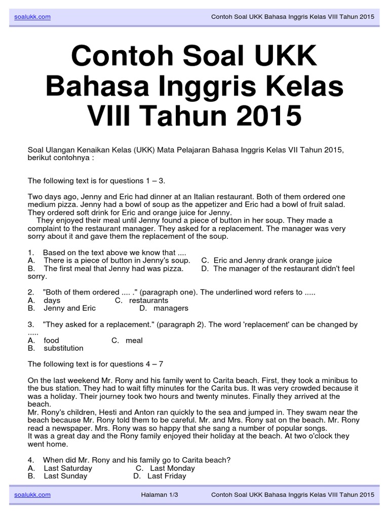 Soal Ukk Bahasa Inggris Smp Kelas 8 Kurikulum 2006 Atau Ktsp Didno76 Com from 1.bp.blogspot.com Selanjutnya untuk download kunci jawab soal pas/uas/ukk smp/mts kelas 8 kurikulum 2013 semester 2 silakan klik tautan dibawah ini: Bahasa inggris kelas 7,,,, bahasa inggris sebagai mata pelajaran yang sering di jumpai disekolahan smp dan mts atau sekolah menengah pertama. Adik adik yang masih duduk dibangku kelas 8 smp/mts kakak ada info terbaru ni, bahwa kakak telah selesai menyusun beberapa contoh soal uts, uas dan soal ukk pada mata pelajaran bahasa inggris. Desain soal latihan ini sebagai hasil pelatihan membuat soal online melalui blogspot. Selamat datang dan selamat berjumpa kembali di situs dicariguru.com. Kunci jawaban soal ukk/pat bahasa indonesia kelas 8 semester 2 kurikulum 2013. Ulangan kenaikan kelas (ukk) atau penilaian akhir semester (pat) merupakan salah satu bentuk evaluasi belajar untuk peserta didik. Soal bahasa inggris kelas 8.
